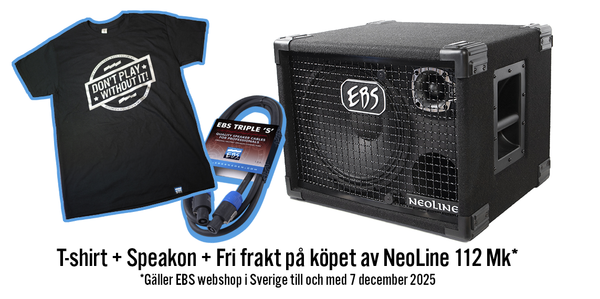 Köp en EBS NeoLine 112 Mk2 senast 7 december 2025, så får du en Speakon högtalarkabel, t-shirt och fri frakt på köpet till ett totalt värde om 780 SEK. Erbjudandet gäller EBS webbshop och endast i Sverige. Välj t-shirtstorlek under "options" innan du lägger till varan i varukorgen.
